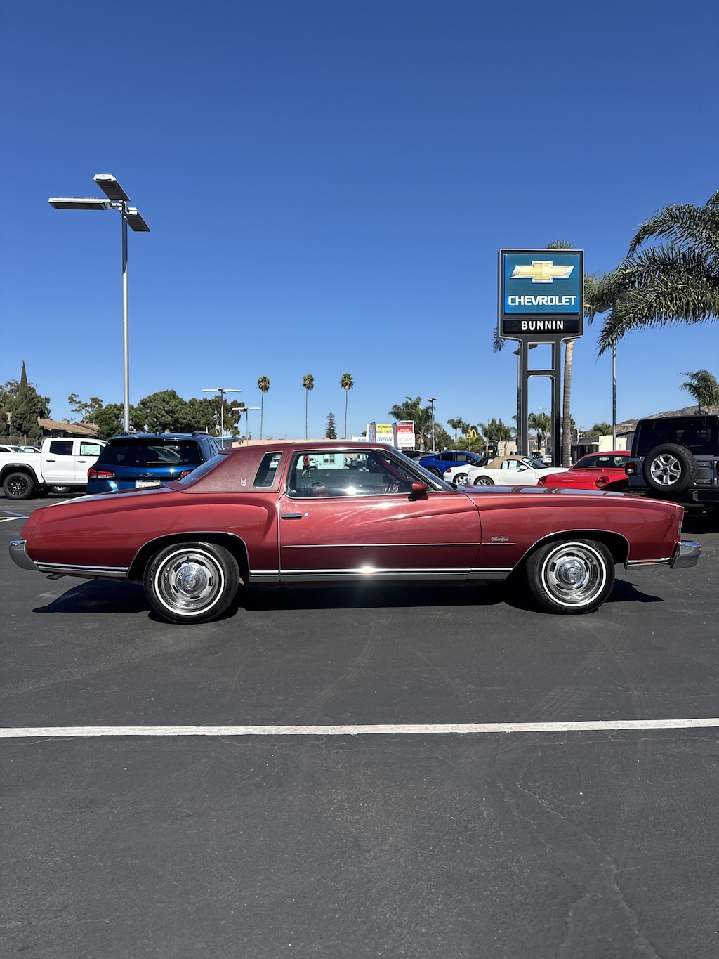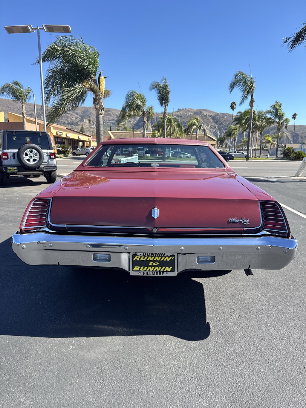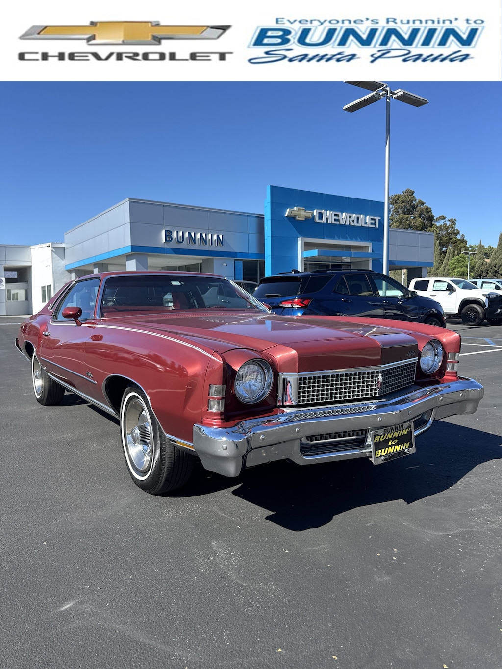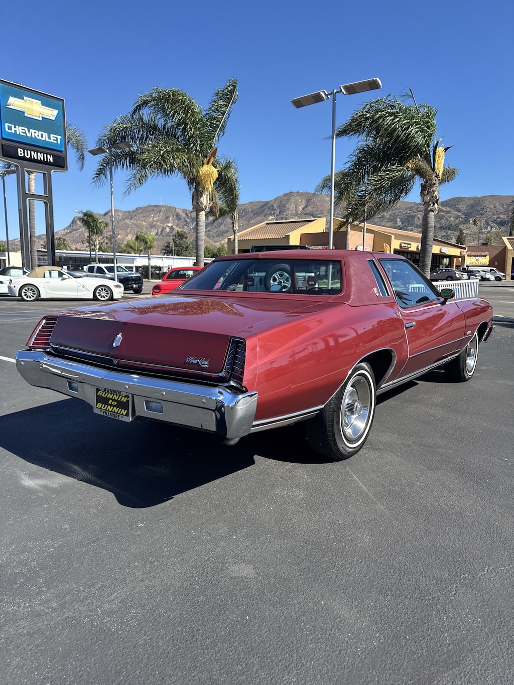 This Monte Carlo is finished in red with a matching red vinyl Landau roof and contrasting white pinstripes.